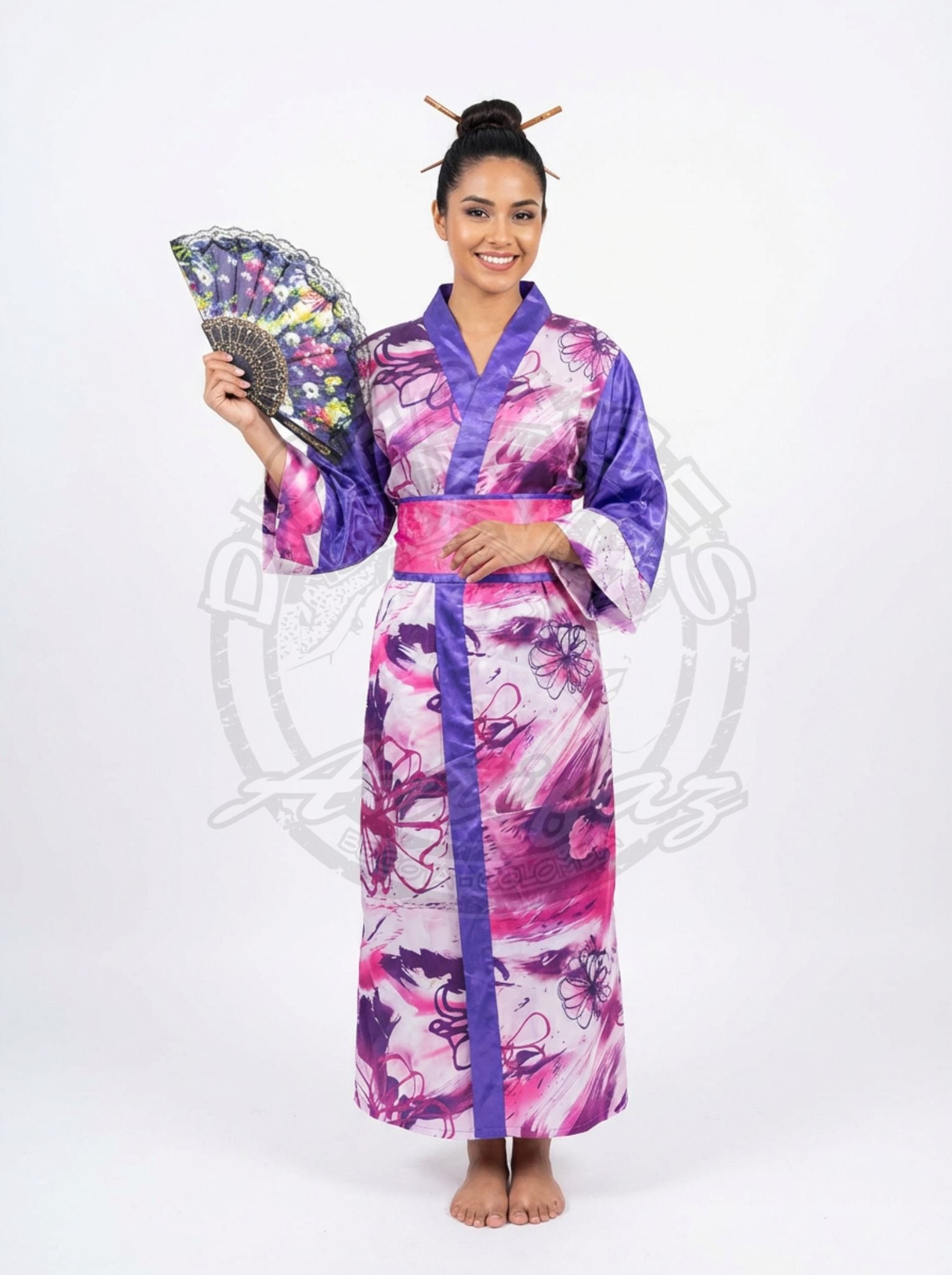 Este diseño largo hasta los tobillos se caracteriza por sus mangas amplias y fluidas, cinturón tipo obi con lazo estructurado en la parte posterior (estilo cojín), y accesorios que completan el look tradicional como abanico y palitos decorativos para el cabello.