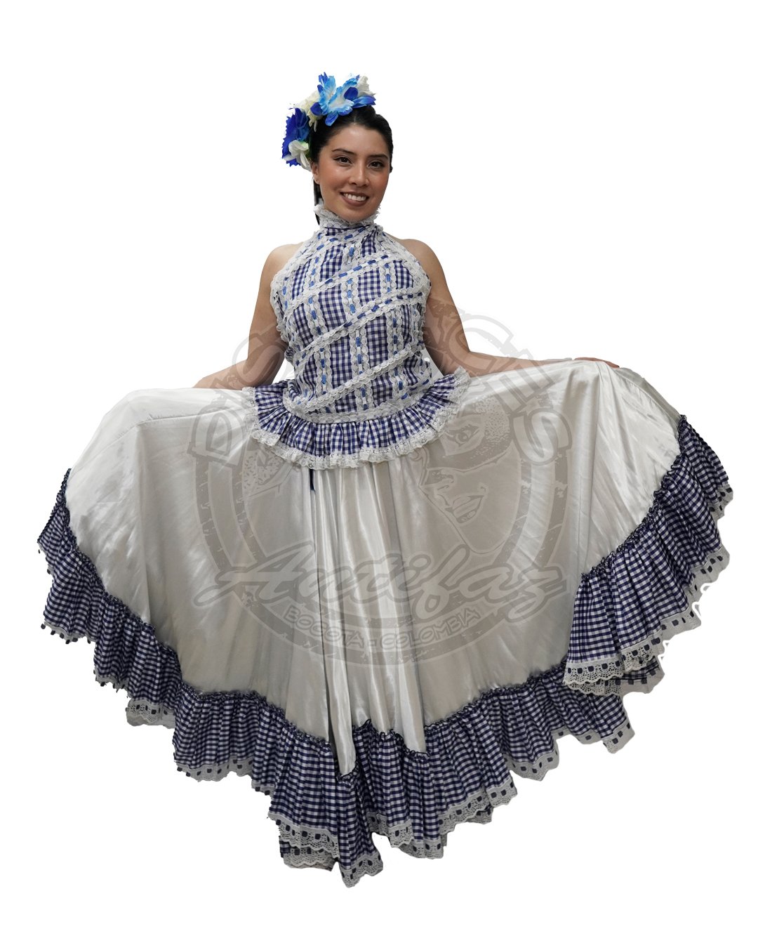La falda de cuadros azules resalta en escenario por su volumen y contraste, mientras que la blusa complementa el conjunto conservando la estética folclórica que identifica a la cumbia colombiana. Es una opción ideal para presentaciones escolares, muestras culturales, festivales folclóricos, comparsas y celebraciones patrias.