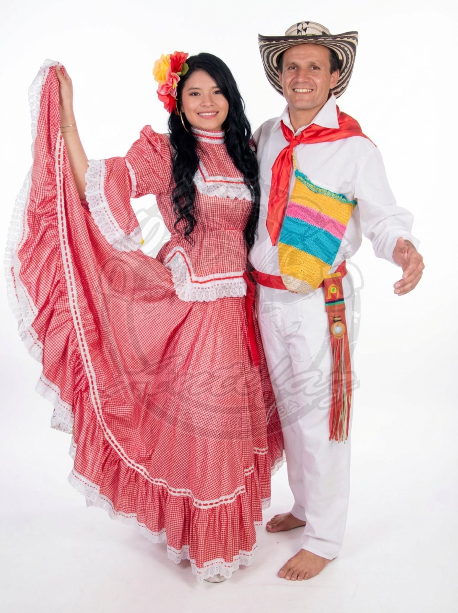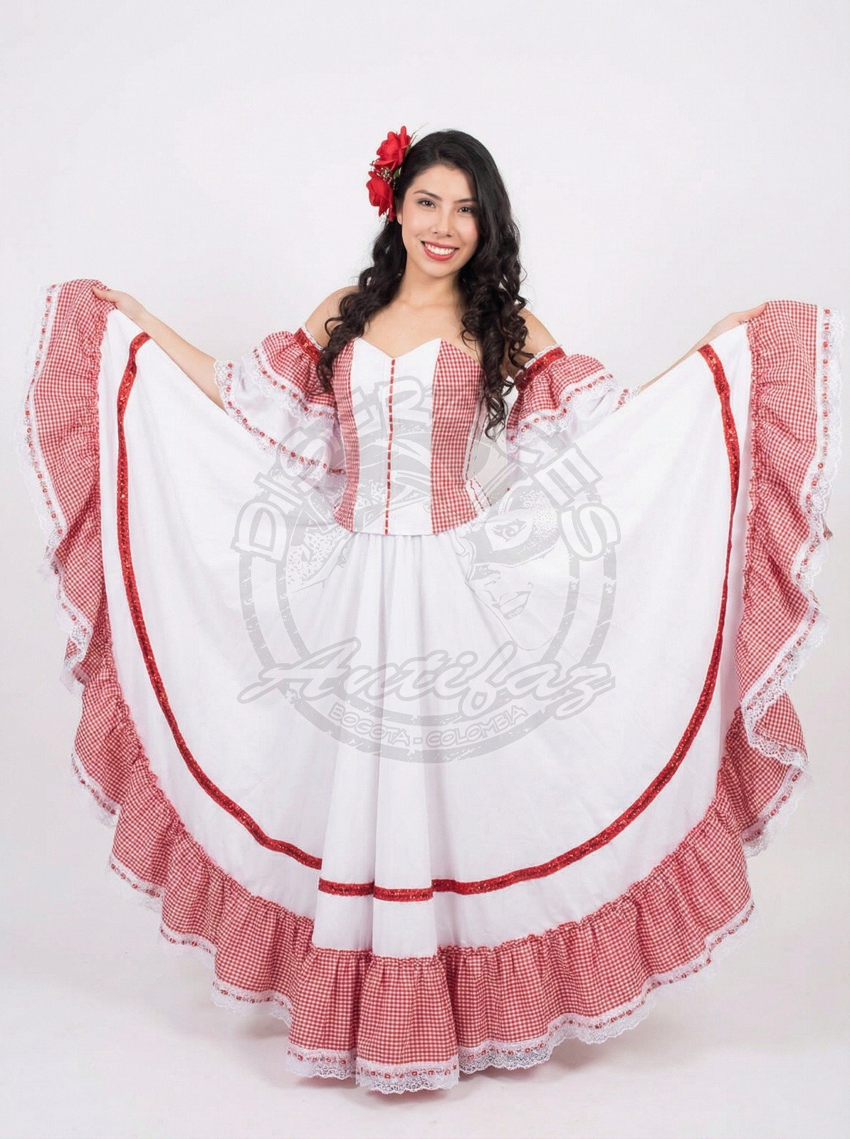 La combinación rojo y blanco es una de las más representativas dentro del folclore colombiano, aportando contraste, presencia y carácter en escenario. La falda amplia, acompañada de blusa con arandelas o detalles tradicionales, mantiene la esencia auténtica del traje típico de cumbia.